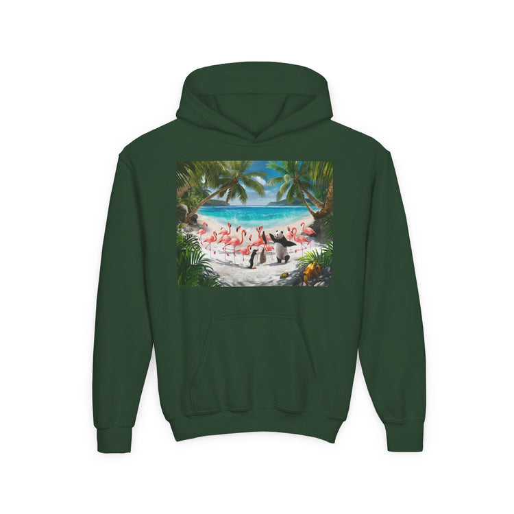 Lifestyle and Versatility This fun graphic hoodie elevates every outfit—perfect for school, family adventures, beach days, or casual gatherings. The Tropical Youth Hoodie with Flamingos and Beach Scene is the ultimate versatile choice for any young explorer, ready to bring a beach vibe wherever they go.