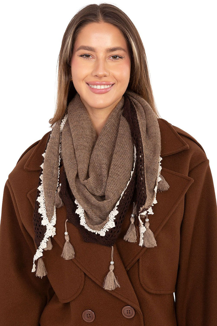 Elegant and feminine triangular scarf with a varied texture of material, made of delicate viscose, which is pleasant to the touch and light. The model, with a length of 52 cm and a width of 152 cm, lays perfectly on the shoulders, adding style to any outfit. The scarf is adorned with lace details and fringes with pearls, giving it a subtle, romantic character. Perfect for everyday wear as well as special occasions, it will beautifully complement both an elegant coat and a casual jacket.