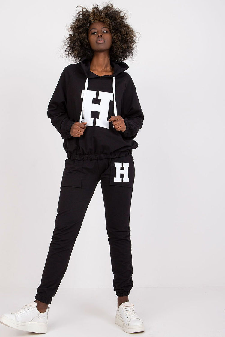 A sweatshirt set consisting of a sweatshirt and pants. Sweatshirt with long sleeves and a hood. Long pants with waist tie and slip pockets.